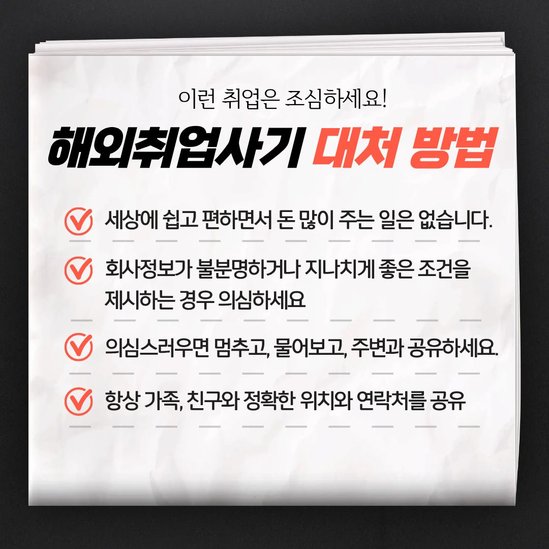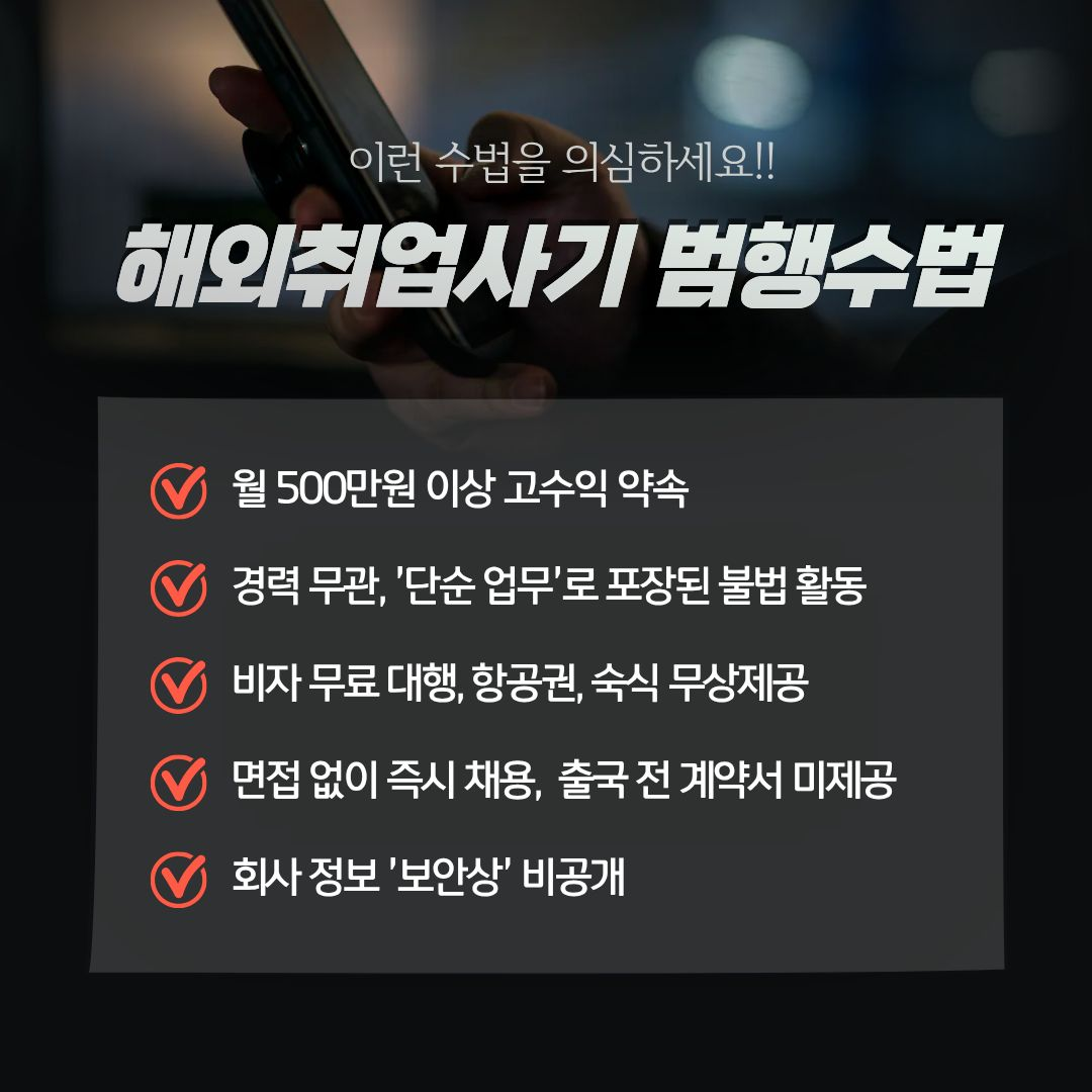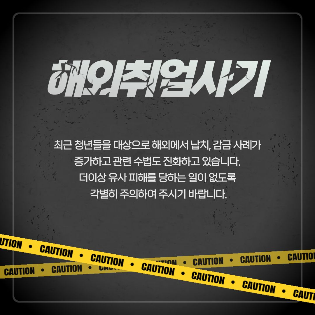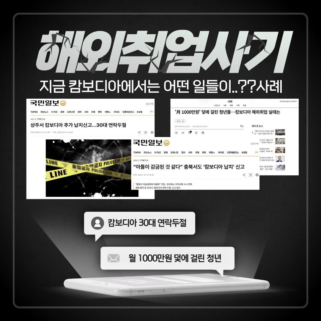 학생공지 학생공지 일반공지 장학/학자금 공지 감염병안내 공모/모집/시험 도서관 생활관 기부금공개 업무추진비공개 보육교원연수원 기타공고 충청대학교_대표-학생공지(대표_충청마당_공지사항_학생공지) 상세보기 - 제목, 내용, 파일, 작성자, 조회수, 작성일, 학과공지, 주소링크 정보 제공 [노란화분] 해외 취업 사기 범죄 예방 안내 작성자 : 이정민 작성일 : 2025-10-23 조회 : 195 최근 해외 취업 사기 범죄가 심각합니다. 주의하세요. 파일 png 문서 캄보디아 범죄 예방1.png png 문서 캄보디아 범죄예방 2.png png 문서 캄보디아 범죄예방 3.png png 문서 캄보디아 범죄 예방 4.png png 문서 캄보디아 범죄예방 5.png 주소링크 목록 게시물삭제 광고 반복작성 욕설 본인삭제 게시물삭제 이전글 [인권센터] 대학생 여성 1인 가구 대상 보안장비 무상지원 안내 다음글 【취업허브센터】 2025년 졸업특화프로그램 『인적성 시험 꿀팁 대방출 프로젝트』 운영 안내