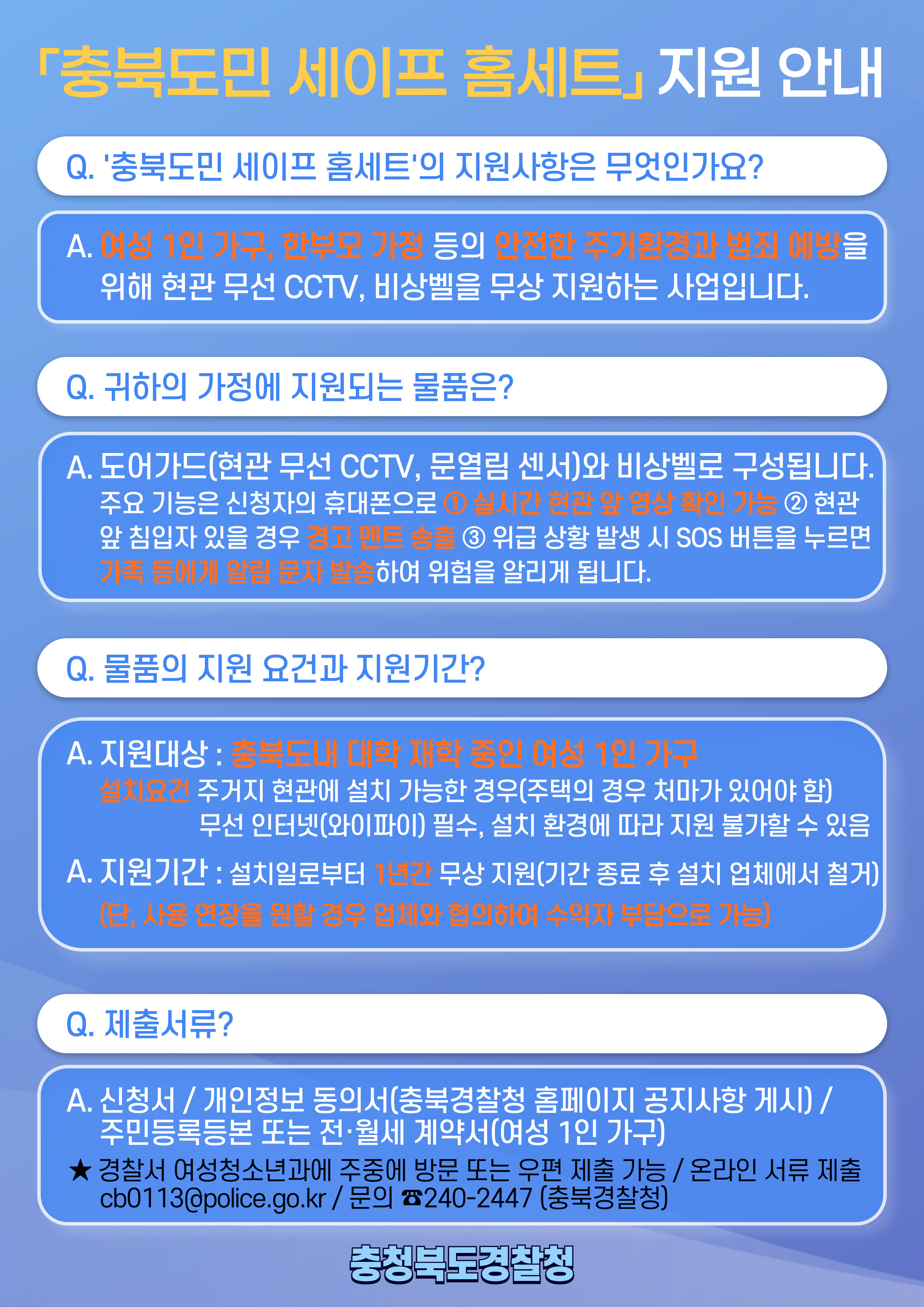 학생공지 학생공지 일반공지 장학/학자금 공지 감염병안내 공모/모집/시험 도서관 생활관 기부금공개 업무추진비공개 보육교원연수원 기타공고 충청대학교_대표-학생공지(대표_충청마당_공지사항_학생공지) 상세보기 - 제목, 내용, 파일, 작성자, 조회수, 작성일, 학과공지, 주소링크 정보 제공 [인권센터] 대학생 여성 1인 가구 대상 보안장비 무상지원 안내 작성자 : 이정민 작성일 : 2025-10-24 조회 : 208 도내 대학 재학 중인 여성 1인 가구 대상, 세이프안심홈세트 지원 안내입니다. 파일 jpg 문서 안심장비 세이프 홈세트 지원 안내문.jpg hwp 문서 서비스 이용 신청서 및 개인정보 수집이용 동의서(공통 ).hwp 주소링크 목록 게시물삭제 광고 반복작성 욕설 본인삭제 게시물삭제 이전글 【취업허브센터】 2025 모의면접 경진대회(11.19.(수)) 행사 안내 다음글 [노란화분] 해외 취업 사기 범죄 예방 안내